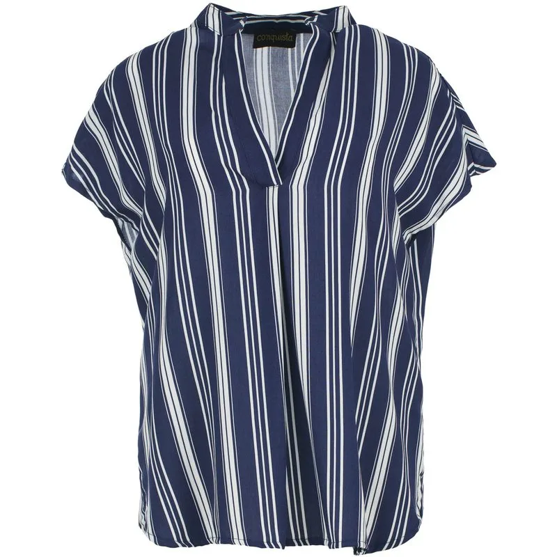 Ga stijlvol de zee op in deze gestreepte blouse met nautisch motief in viscose. Deze top is gemaakt van 100% geweven viscose en biedt een luchtige en ademende pasvorm die perfect is voor escapades aan zee of casual uitjes. Het klassieke marine-witte streeppatroon weerspiegelt de tijdloze maritieme esthetiek, terwijl de V-hals en losse mouwen een vleugje modern raffinement toevoegen. In combinatie met een frisse witte broek of je favoriete jeans is deze blouse zeker een veelzijdige aanvulling op je garderobe.