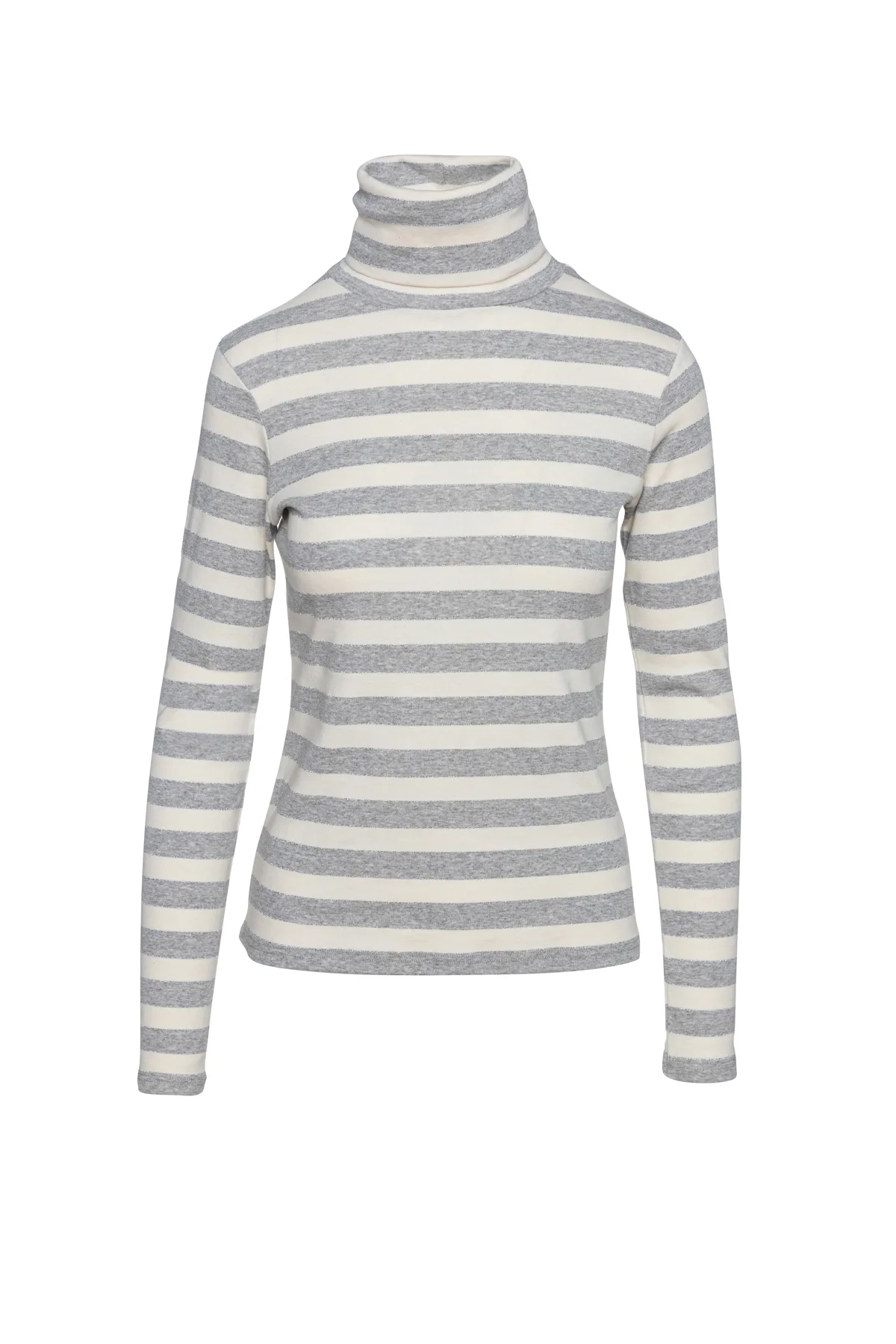 Gestreept poloshirt in ecru en grijs in stretchstof. Lange mouwen. Ons model heeft een lengte van 178 cm en draagt maat 36. Afmetingen voor maat 38 (in cm):Buste-37; Lichaamslengte-57; Taille-36; Schouderbreedte-34; Zoomlijn-41,mouwen-63. Kledingstuk is getailleerd.