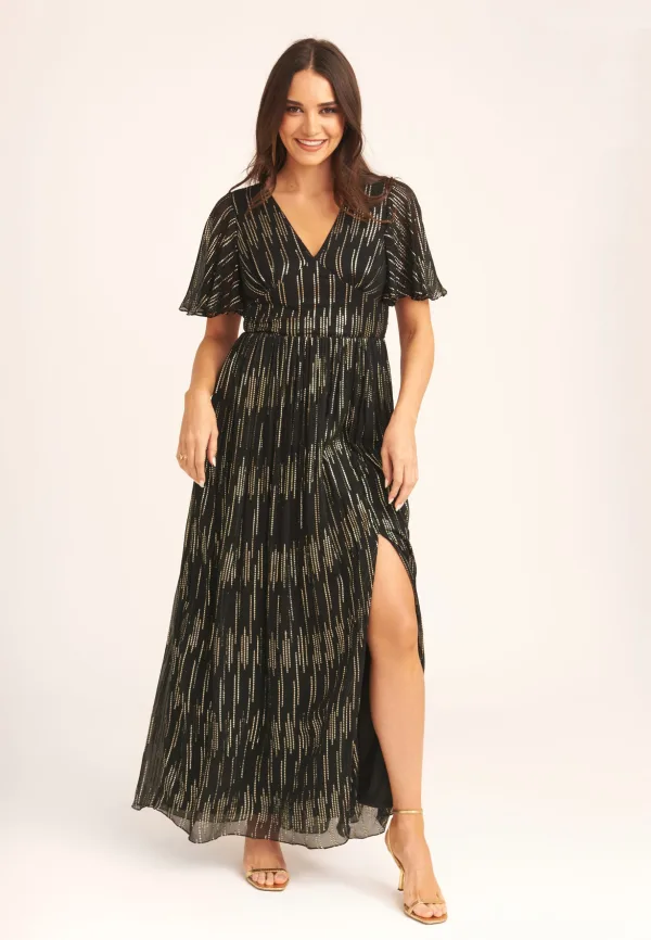 Deze zwarte dromerige jurk zal alle blikken trekken op die aanstaande speciale gelegenheid. Met een zilver glanzend gedrukt materiaal, een engelenschouderontwerp, een zijscheurtje en een V-hals, te combineren met veterschoenen voor een look waar we dol op zijn.
