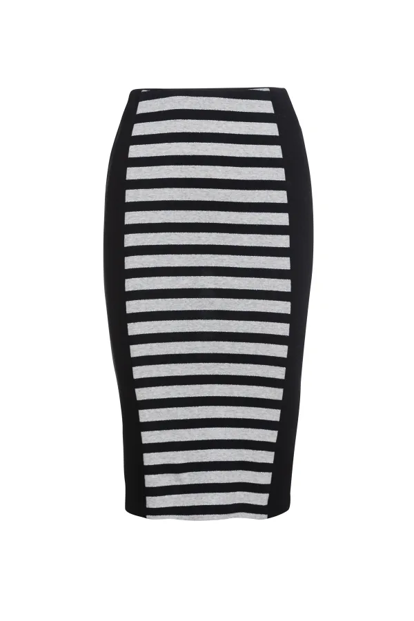 Zwart met grijs gestreepte kokerrok van stretchstof. Brede effen zwarte verticale panelen aan de zijkanten. Aansluitend silhouet. Ons model is 178 cm en draagt maat 36. Afmetingen voor maat 38 (in cm): Lichaamslengte - 67; Taille - 32; Hemline - 39. Aansluitend model.
