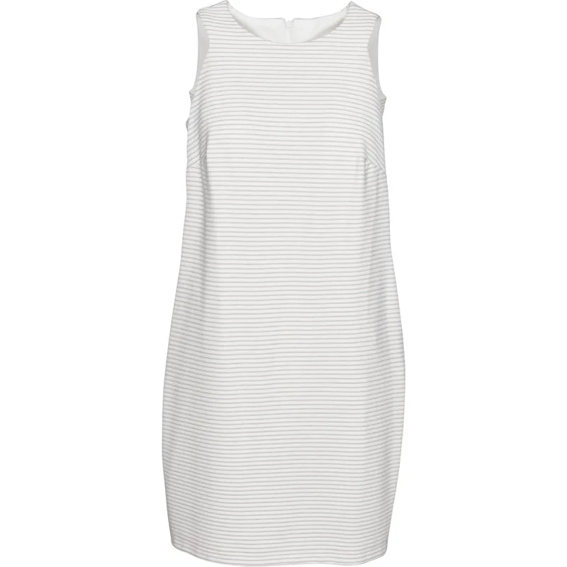 Gestreepte zakjurk met structuur in stretchjersey van Punto di Roma. Mouwloos en een ronde halslijn. Darts op de borst en 2 steekzakken. Verborgen ritssluiting op de rug, toon op toon. Ons model is 172cm en draagt maat 36/S. Afmetingen voor maat 36 (in cm): Schouder -29; Borst-46; Taille-50; Onderkant-53; Lichaamslengte-93. 70%VISCOSE-25%PA-5%ELASTANE
