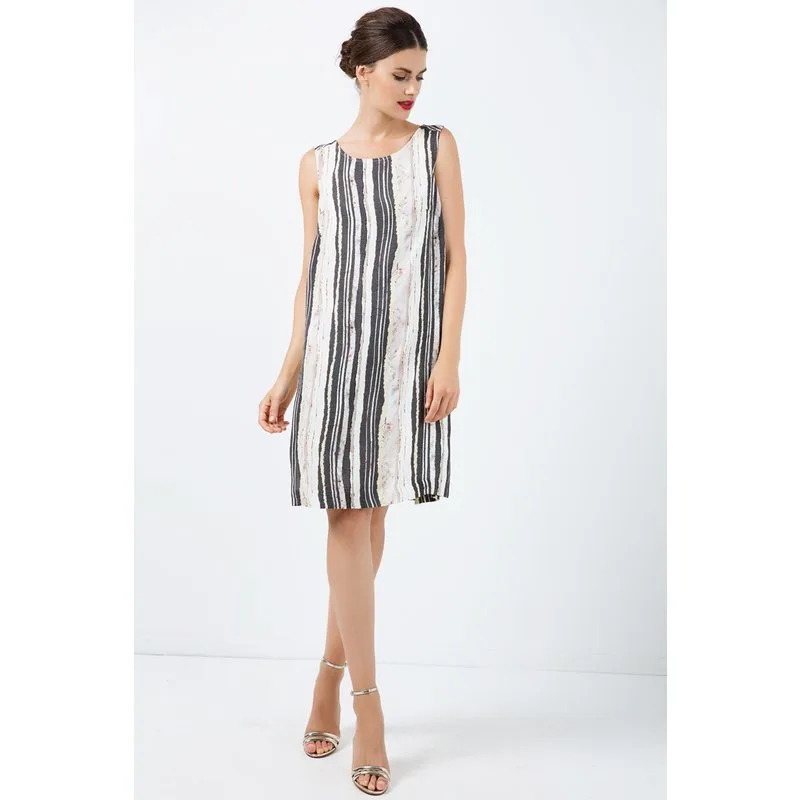 Mouwloze zomerjurk van geweven gestreepte stof, 100% viscose. Ronde halslijn. Contrasterende roze bies van 0,5 cm aan de binnenkant van de hals en de mouwen. Twee figuurnaden bij de buste. Extra smalle ceintuur in dezelfde stof aan de ene kant en effen roze stof aan de andere kant. Aan de uiteinden van de ceintuur zitten twee goudkleurige stoppers. Brede plooi van 4 cm op de rug. Bovenaan de plooi zitten drie sierknopen. De plooi vanaf de halslijn naar beneden wordt voor 20cm vastgezet waarna hij aan de achterkant vrij uitloopt in de breedte van de jurk. Splitjes van 15 cm aan de zijkanten. Ontspannen recht silhouet. Ons model is 178 cm lang en draagt maat 36. Afmetingen voor maat 38 (in cm):Buste-50; Lichaamslengte-93; Taille-58; Schouderbreedte-37; Hemline-61. Kledingstuk is loose fit.