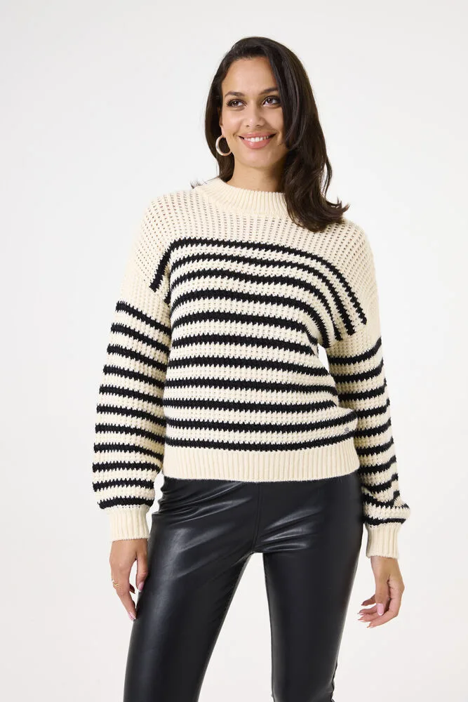 Gebreide trui met streeppatroon. Een trendy item, ideaal voor dit seizoen! Deze trui heeft lange mouwen, een opstaande hals en een relaxed fit. Dit item is gemaakt van 60% acryl en 40% polyester.