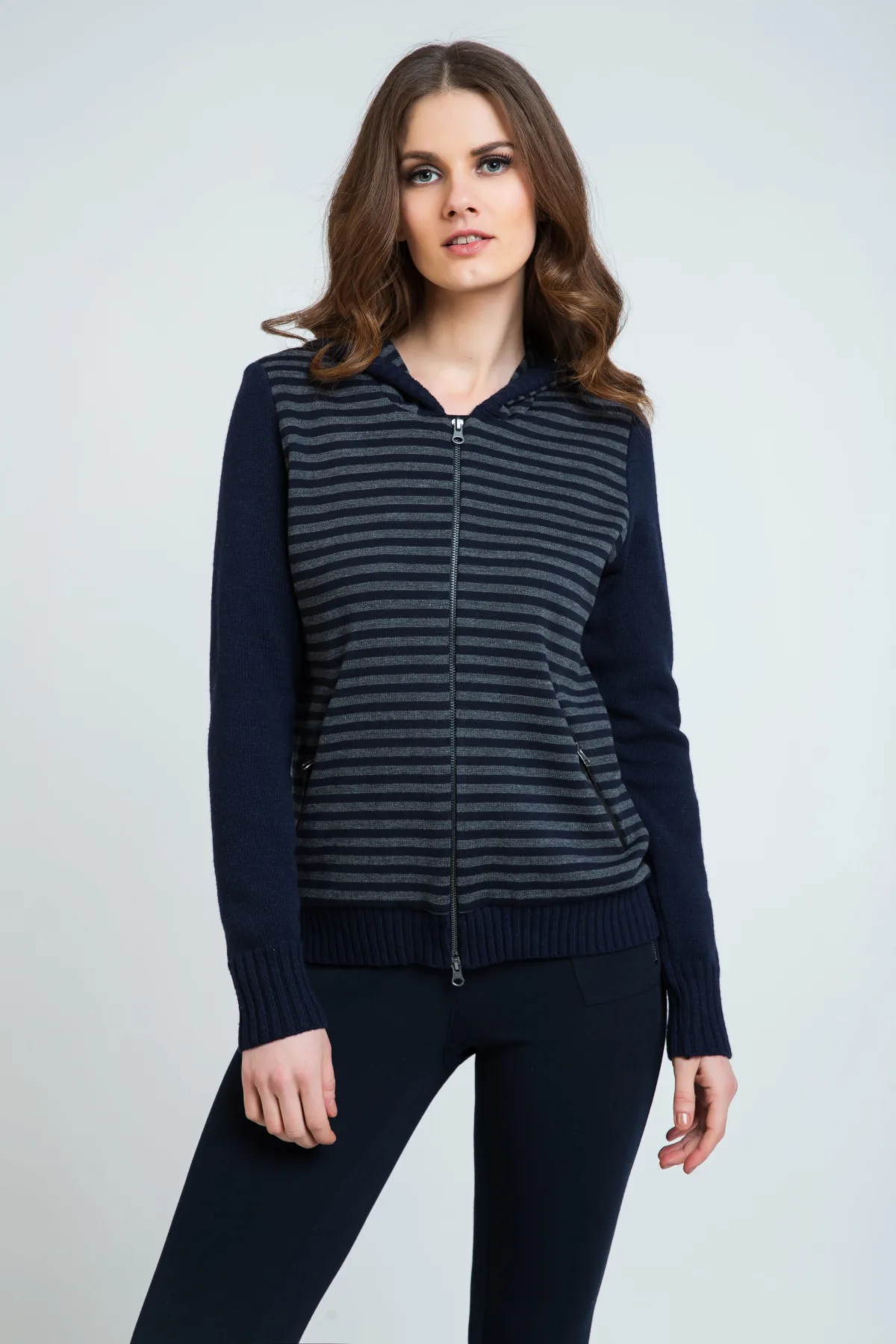 Lange mouwen vest in gebreide stof. Strepen op het lichaam en de capuchon. Gebreide stof in effen blauw op de mouwen, zoom en rand van de capuchon. Sluit aan de voorkant met een grijze rits. Twee binnenzakken aan de voorkant met pleather afwerking die sluiten met een rits. Lengte voor maat 38: 66 cm.