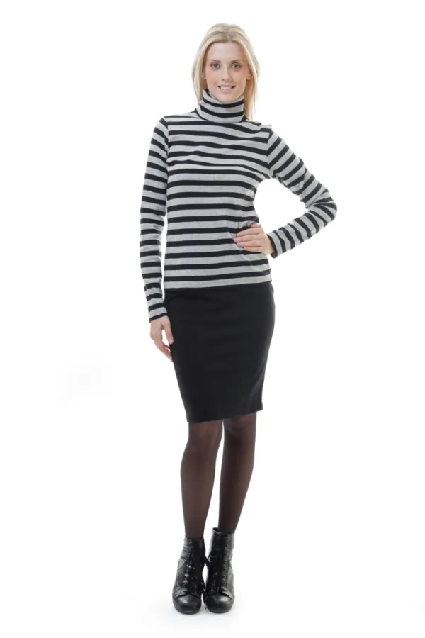 Gestreepte top met polokraag in zwart en grijs van stretchstof. Lange mouwen. Aansluitend silhouet. Ons model is 178 cm lang en draagt maat 36. Afmetingen voor maat 38 (in cm):Buste-37; Lichaamslengte-57; Taille-36; Schouderbreedte-34; Zoomlijn-41,mouwen-63. Kledingstuk is getailleerd.