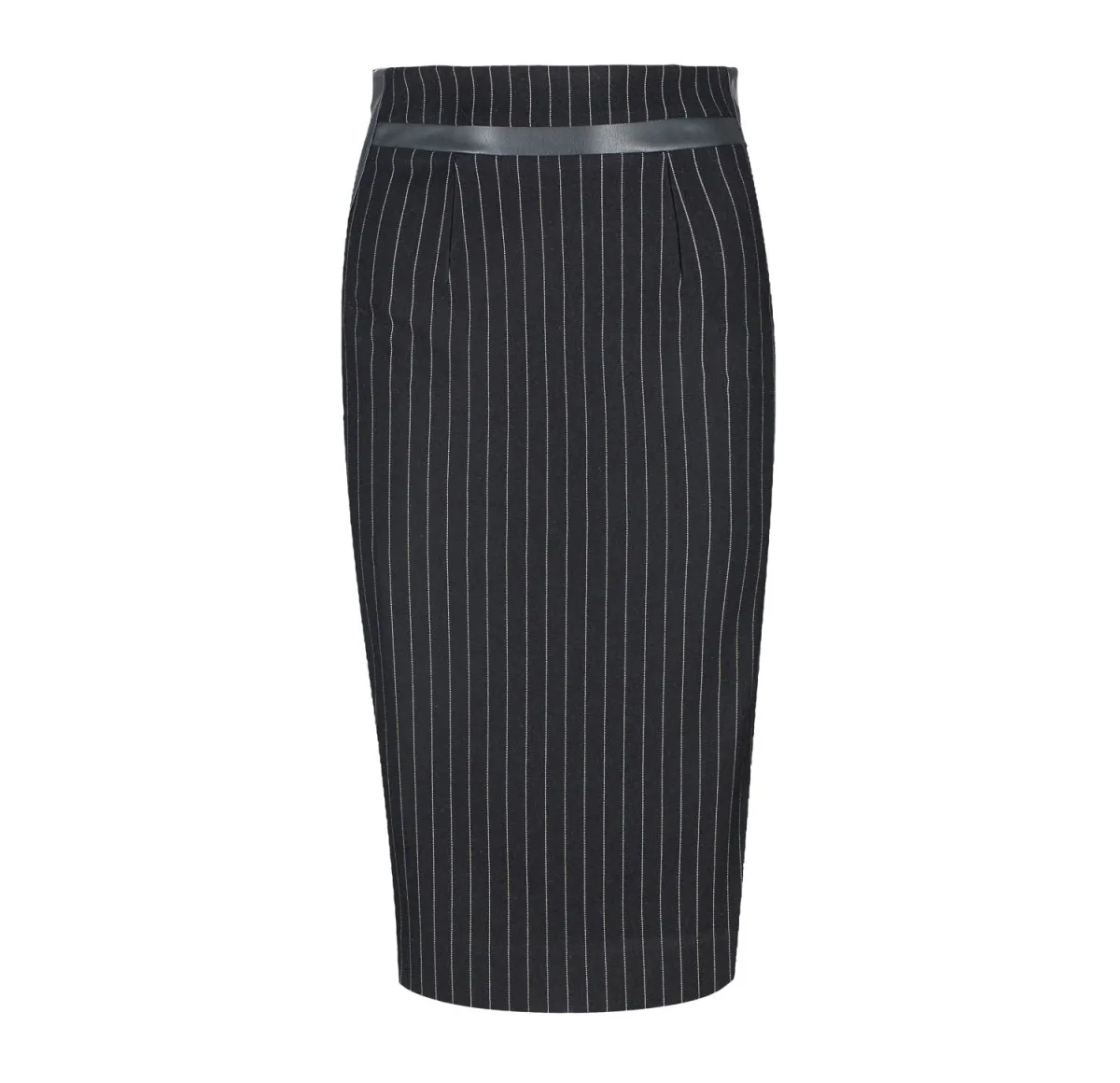 Deze zwarte kokerrok met hoge taille is gemaakt van Punto di Roma-stof met lichtgrijze strepen. De taille heeft een band van imitatieleer. Met een verborgen rits en een kleine split aan de achterkant. Met een voering van stretchpolyester. De rok heeft een midi-lengte en een aansluitend silhouet.