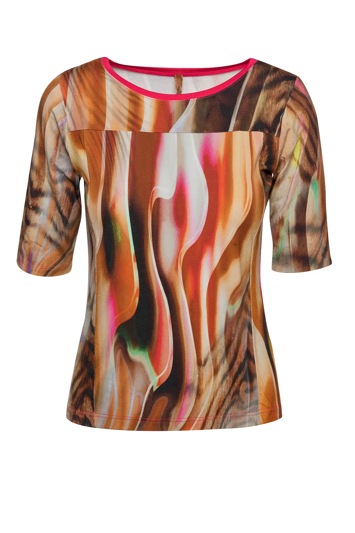 Top van stretch jersey stof met print. Ronde halslijn en ¾ mouwen. Naaddetail op de borst.