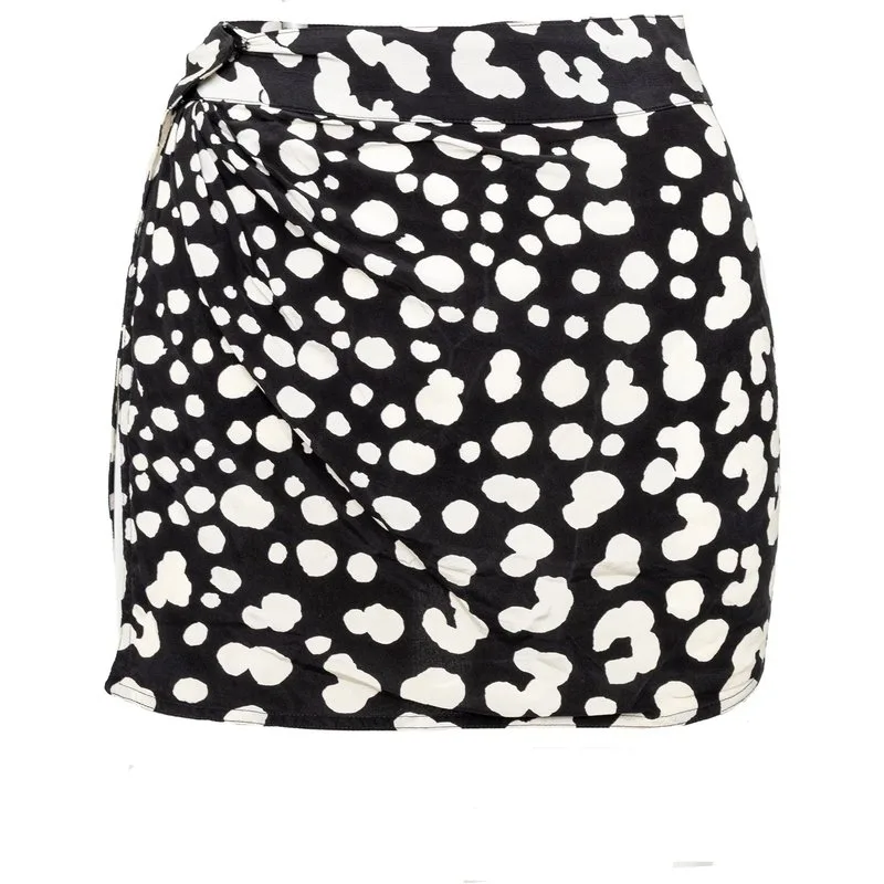 VINTAGE, RRP ALS NIEUW Zwart-witte zijden minirok in gemengde stippen- en dierenprints, met een zijsplit en knoopsluiting. Een speelse statement, veel manieren om te stylen. Opmerkingen: De maat is niet aangegeven. Afmetingen: lengte: 1016 mm schouderbandlengte: 0 mm hengelval: 0 mm