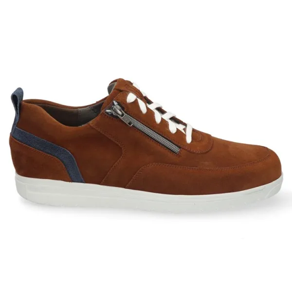 Gijs 2153 – Sportieve Suède Sneaker in Cognac (Wijdte K)Geef uw garderobe een warme upgrade met deze stijlvolle sneakers van het Nederlandse kwaliteitsmerk Gijs. Uitgevoerd in een rijke cognac-kleur met stoere blauwe accenten, biedt dit model de ideale mix tussen een sportieve look en het allerhoogste draagcomfort. Speciaal ontworpen voor de man die een extra brede pasvorm nodig heeft.Ruimte zonder concessies (Wijdte K)Heeft u vaak moeite met het vinden van modieuze schoenen die breed genoeg zijn? Deze sneaker is uitgevoerd in Wijdte K. Dit betekent dat de schoen extra breed is en meer volume biedt bij de bal van de voet en de wreef. Zo geniet u van maximale bewegingsvrijheid zonder in te leveren op een modern design.De kenmerken van de Gijs 2153:Warm Design: Het hoogwaardige cognac suède wordt gecombineerd met contrastrijke witte veters en een subtiel blauw detail op de hiel, wat zorgt voor een frisse, eigentijdse uitstraling.Dubbel Gemak: Dankzij de handige ritssluiting naast de veterstrip trekt u de schoenen in een handomdraai aan en uit. Eenmaal de veters goed gestrikt, hoeft u ze daarna nooit meer aan te raken.Volledig Lederen Interieur: De binnenvoering van leer zorgt voor een uitstekende vochtregulatie en voorkomt branderige voeten, zelfs na een lange wandeling.Geschikt voor Steunzolen: Het uitneembare voetbed maakt het mogelijk om probleemloos uw eigen maatzolen in de schoen te plaatsen.Lichtgewicht Loopzool: De witte rubberen zool is flexibel en schokabsorberend, wat zorgt voor een soepele afwikkeling van de voet.Specificaties op een rij:Kleur: Cognac / BlauwMateriaal: SuèdeVoering: LeerSluiting: Veter + RitsZool: Rubber (Antislip)Wijdte: K (Extra breed)Stylingtip: Deze cognac sneakers staan fantastisch onder een donkerblauwe jeans of een beige chino. Maak de look compleet met een bijpassende riem in een vergelijkbare tint.