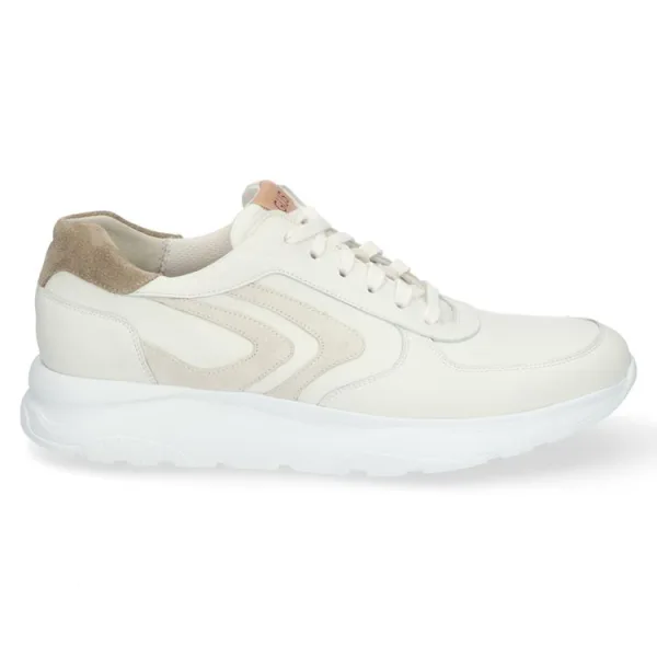 Gijs 2160 – Moderne Leren Sneaker in Off-White (Wijdte H)Kies voor een frisse, eigentijdse look met de Gijs 2160. Deze sneaker combineert hoogwaardig wit leer met zachte suède accenten in zandkleur. Dankzij de dikkere, lichtgewicht zool krijgt de schoen een sportief karakter, terwijl de verfijnde afwerking zorgt voor de kwaliteit die u van Gijs gewend bent.De perfecte tussenmaat (Wijdte H)Deze sneaker is uitgevoerd in Wijdte H. Dit is de ideale pasvorm voor heren voor wie een standaardmaat net te krap is, maar een extra brede maat te ruim. Wijdte H biedt net dat beetje extra ruimte bij de voorvoet, zodat u de hele dag comfortabel kunt lopen zonder knelpunten.Waarom de Gijs 2160 in uw collectie hoort:Luxe Materiaalmix: Het gladde witte leer wordt prachtig gecombineerd met beige en taupe suède details op de hiel en het zijpand voor een dynamisch effect.Gezond Voetklimaat: De schoen is volledig gevoerd met leer, wat zorgt voor een uitstekende ventilatie en een zacht gevoel rondom de voet.Sportieve Comfort-zool: De dikke, witte rubberen zool biedt niet alleen een moderne 'chunky' look, maar garandeert ook optimale demping bij elke stap.Eigen Inlegzolen: Net als alle modellen van Gijs beschikt ook deze sneaker over een uitneembaar voetbed, waardoor hij zeer geschikt is voor eigen steunzolen.Stabiele Pasvorm: De stevige hielkap en de vetersluiting zorgen ervoor dat uw voet goed gefixeerd blijft tijdens het wandelen.Specificaties:Kleur: Off-White / Beige (Zand)Materiaal: Leer / SuèdeVoering: Hoogwaardig leerSluiting: VetersluitingZool: Extra lichte, schokabsorberende rubberzoolWijdte: H (Iets breder dan gemiddeld)Stylingtip: Combineer deze witte sneakers met een lichte linnen broek voor een zomerse look, of met een donkere denim om het frisse contrast van het leer echt naar voren te laten komen.