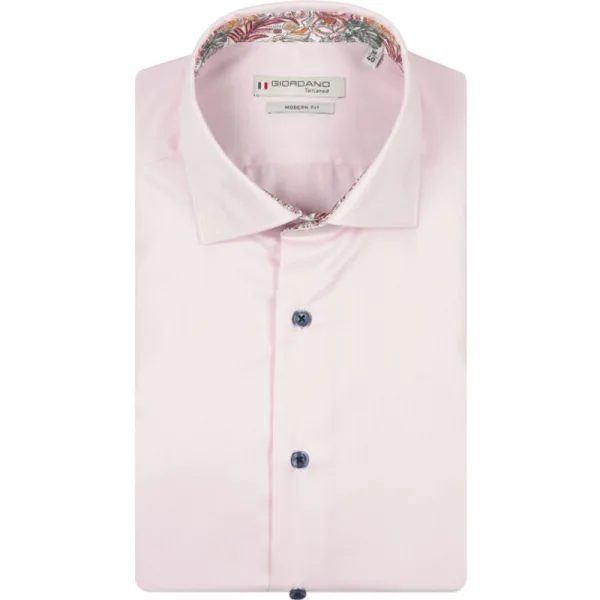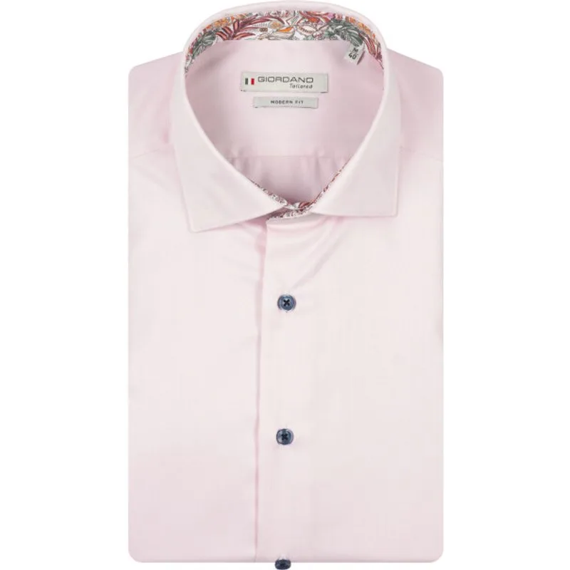 Katoenen uni heren 2-ply overhemd van Giordano. Dit Giordano Tailored heren overhemd heeft korte mouwen en een mooie smalle modern fit pasvorm. De kraag is aan de binnenkant voorzien van een contrasterende bloemenprint. Dit shirt is verkrijgbaar in meerdere effen kleuren en geschikt voor iedere gelegenheid gecombineerd met jeans of chino. Regular fit Borstzakje 100% Katoen Kleurnummer: