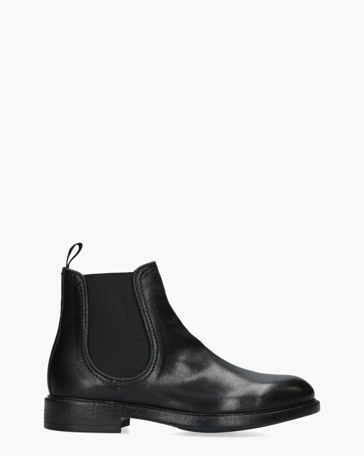 De Giorgio 1958 88610 Chelseaboots stralen tijdloze klasse uit dankzij het gladde zwarte leer en de verfijnde afwerking. De elastische inzetstukken aan weerszijden van de 14 cm hoge schacht zorgen voor een gemakkelijke instap. Binnenin is de schoen voorzien van een leren en stoffen voering met een vast voetbed. De vintage gemaakte zool en de