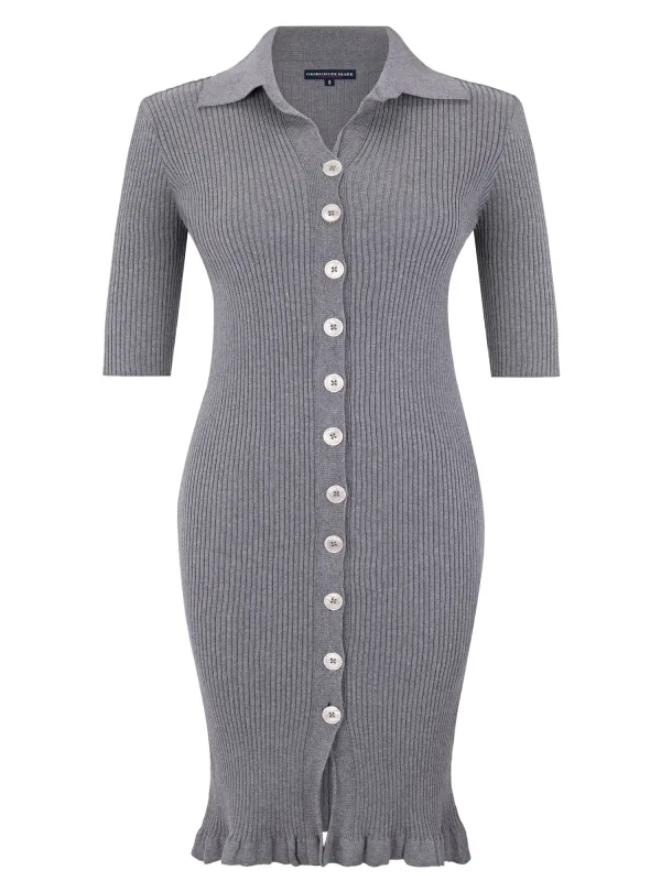 Design: Knop placket; Type sluiting: Knoopsluiting; Materiaal: Knitwear; Motief: Mélange; Details: Ruches; Extra's: Voelt zacht aan; Lengte: Knielengte; Snit: Figuur omarmend; Pasvorm: Aansluitende pasvorm; Armlengte: Halve mouw
