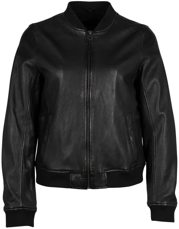 Design: Geribbelde kraag, Rechte zoom, Geribd ceintuurtje, Zakken aan de zijkant; Type sluiting: Ritssluiting; Type jas: Bikerjack; Voering: Licht gevoerd; Materiaal: Leer; Motief: Effen; Extra's: Op staal naden, Stevige stof; Pasvorm: Normale pasvorm