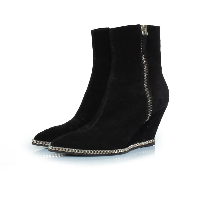 Aanbevolen verkoopprijs Giuseppe Zanotti, zwarte suède Jardin enkellaarsjes met kettingversiering en sleehak. Het artikel heeft lichte slijtplekken bij de hak en verkeert in zeer goede staat. STAAT: goede staat MAAT: 38 BINNENZOOLAFMETINGEN: 24 cm HAKAFMETINGEN: 7,5 cm PLATFORM: 1 cm SCHACHTHOOGTE: 14,5 cm BREEDTE BOVENKANT: 11 cm MATERIAAL: suède, zilver KLEUR: zwart ARTIKELNUMMER: 8390