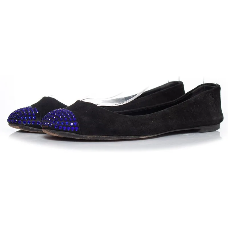 Aanbevolen verkoopprijs Giuseppe Zanotti, suède ballerina's met blauwe strass-steentjes. Het suède heeft lichte slijtage en er ontbreken een paar strass-steentjes. • STAAT: gebruikssporen • MAAT: 37 • AFMETINGEN BINNENZOOL: 23 cm • MATERIAAL: suède • KLEUR: zwart, blauw • ARTIKELNUMMER: 6207