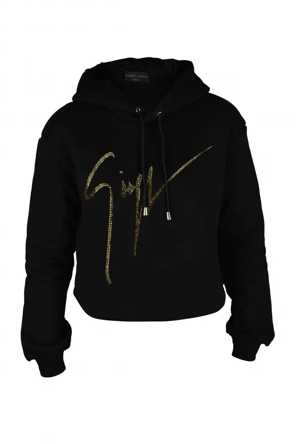 Zwarte korte hoodie van Giuseppe Zanotti.Verstelbaar trekkoord.Handtekeningborduursel in gouden strasssteentjes op de voorkant.Gouden oogjes op de capuchon.Elastische manchetten. Gemaakt in Italië.