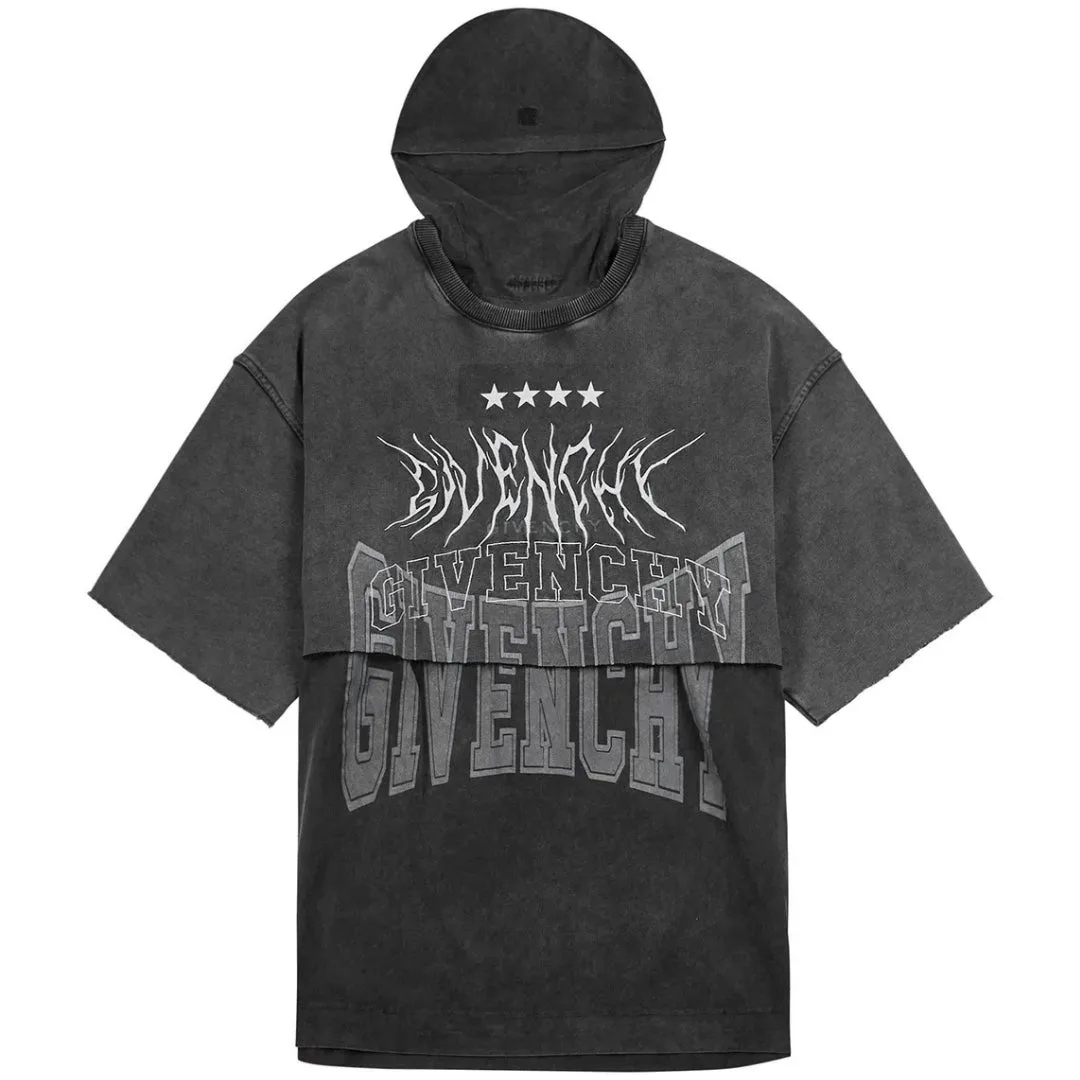 Maak kennis met het grijze Givenchy T-shirt - de perfecte aanvulling op je garderobe! Dit T-shirt is een comfortabele en stijlvolle optie voor elke casual gelegenheid. De oversized pasvorm is zowel trendy als flatterend, waardoor het een must-have is voor modebewuste individuen. Verhoog je stijl met Givenchy!, Givenchy-branding, overlappend hoodie-/T-shirtontwerp, T-shirt met ronde hals en extra capuchon, logo op voor- en achterkant, 100% katoen, streetwear, sterren rond de nek, grijs T-shirt