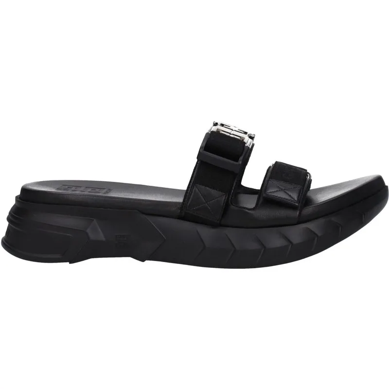 Beschrijving: Het product met MPN BH301QH1A2001 en code F79684 stof in zwart is een slipper en klomp ontworpen door Givenchy. Het heeft kenmerken zoals een logo aan de voorkant. Aanvullende info: Kleur details: Zilver Sluitingstype: Clip-sluiting Materialen: Stof Zool: Rubber Hakhoogte: 4 cm Schuine neus: Open teen Haktype: Middelhakken MPN: BH301QH1A2001 Nieuwe collectie: Nee