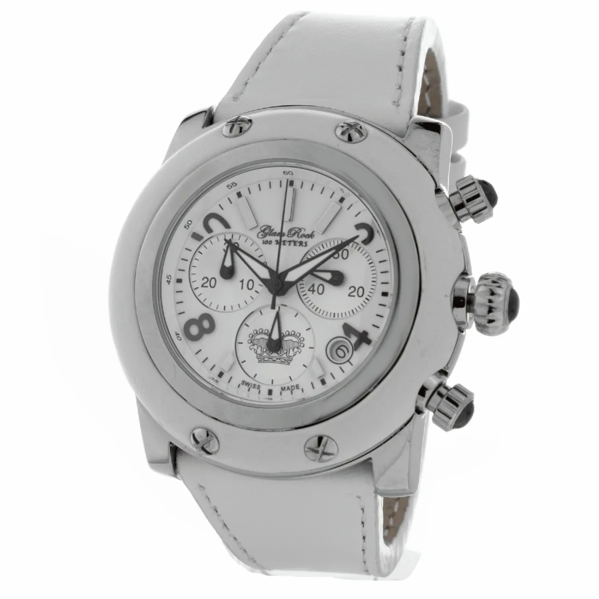 Glam Rock Dameshorloge Kwarts Zilver• Materiaal kastdeksel: Staal• Soort glas: Saffier• Materiaal Band: Leer• Kleur kast: Zilver• Waterdichtheid: 100 m (10 ATM)• Diameter: 46 mm