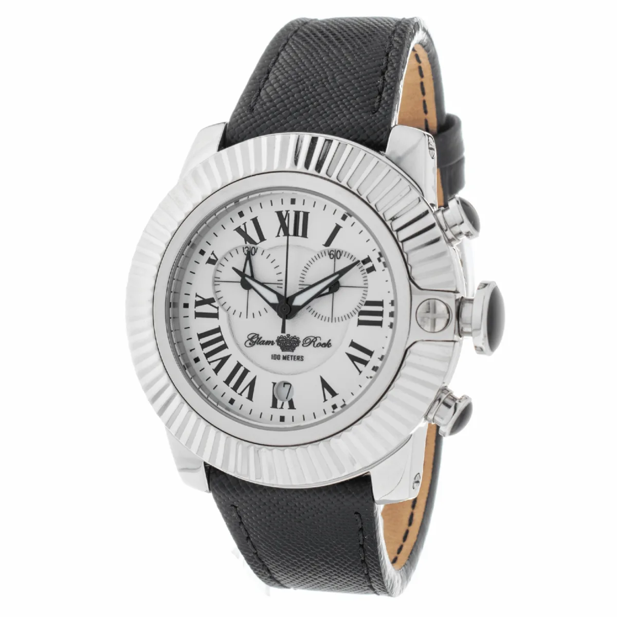 Glam Rock Dameshorloge Kwarts Zilver• Materiaal kastdeksel: Staal• Soort glas: Saffier• Materiaal Band: Leer• Kleur kast: Zilver• Waterdichtheid: 100 m (10 ATM)• Diameter: 44 mm