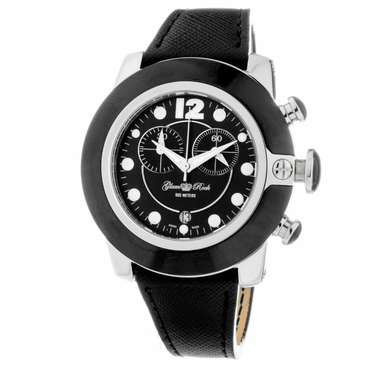 Glam Rock Dameshorloge Kwarts Zwart• Materiaal kastdeksel: Staal• Soort glas: Saffier• Materiaal Band: Leer• Kleur kast: Zwart• Waterdichtheid: 100 m (10 ATM)• Diameter: 44 mm