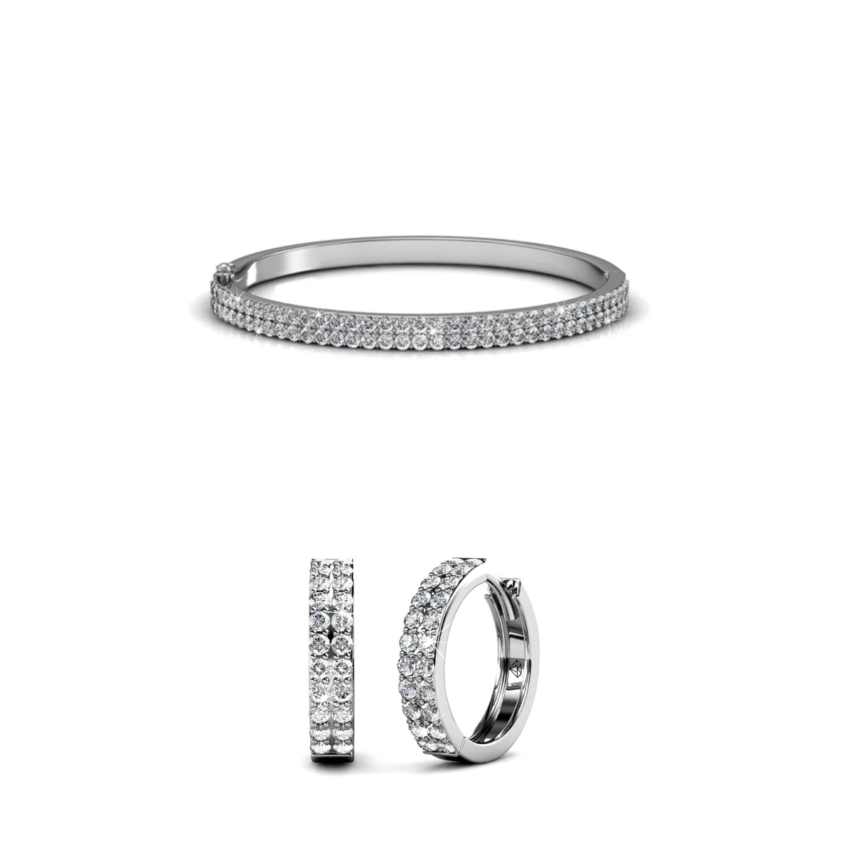 Samenstelling: Messing Afwerking: Rhodium geplateerd Steensoort: Oostenrijks kristal Aantal stenen (stuks): 122 Steenkleur: Kristal Armbanddiameter (mm): 55 Oorbellendiameter (mm): 15