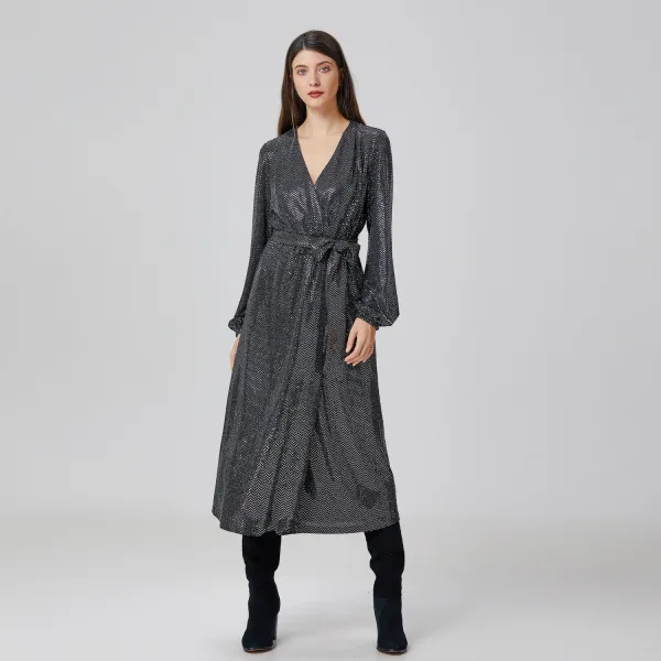 Een jurk met een verleidelijke look, gestructureerd met een gekruiste V-hals, royaal uitlopend en geaccentueerd in de taille door een strikceintuur. Verkrijgbaar in een lange versie voor de zilverkleur en een korte versie voor de roodbronskleur. Een verfijnd en feestelijk exemplaar gesneden in een strassstof, geschikt voor feestelijke gelegenheden zoals cocktails, diners, feesten en oudejaarsavond. Productdetails: Vorm: wijd uitlopende en aansluitende taille Lengte: 114 cm voor de lange versie / 90 cm voor de korte versie Lange mouwen V-hals Geen sluiting / om aan te trekken