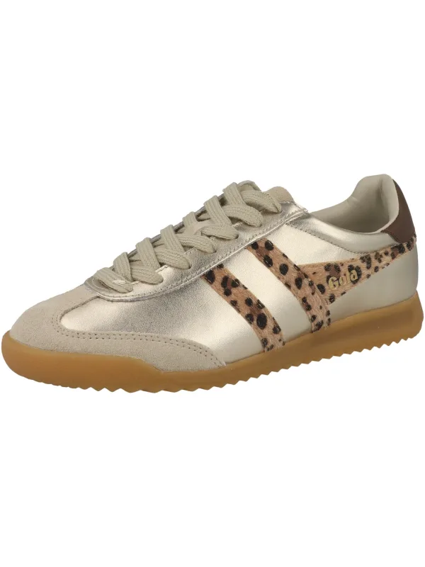 Geïnspireerd door zijn voorganger uit 1985, is de Torpedo Glimmer Safari voor dames van Gola voorzien van een lederen inzetstuk met een prachtig luipaardprint. Gecombineerd met een gouden metallic bovenwerk, een korte suède neus en een bruine achterkant, heeft deze sneaker Gola onmiskenbaar een chique charme, met een mix van retro-invloeden en een resoluut modern design.Houd er rekening mee dat, vanwege de aard van het patroon op het bovenwerk, het ontwerp van elke schoen licht kan afwijken van de afgebeelde afbeelding. Bovendien zorgt de individuele plaatsing van het print dat het patroon verschillend zal zijn op elke schoen.Gola Torpedo Glimmer Safari voor damesluipaarddetailsGouden metallic bovenwerkVetersluitingRubberen zool