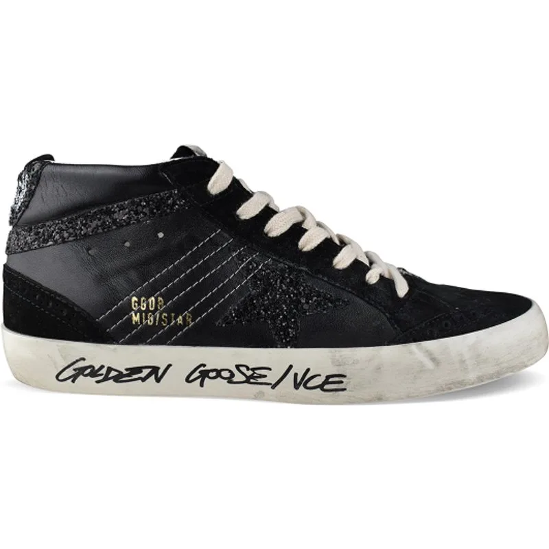 Sneakers Golden Goose Mid Star model in zwart leer.Zwarte ster met pailletten op de zichtbare kant. Zwarte suède details.Zwarte pailletten teller met wit logo.Goudkleurig logo op zichtbare zijde.Tong met logopatch.Rubberen zool met versleten effect en zwart logo op zichtbare zijde. Off-white vetersluiting.Made in Italy.