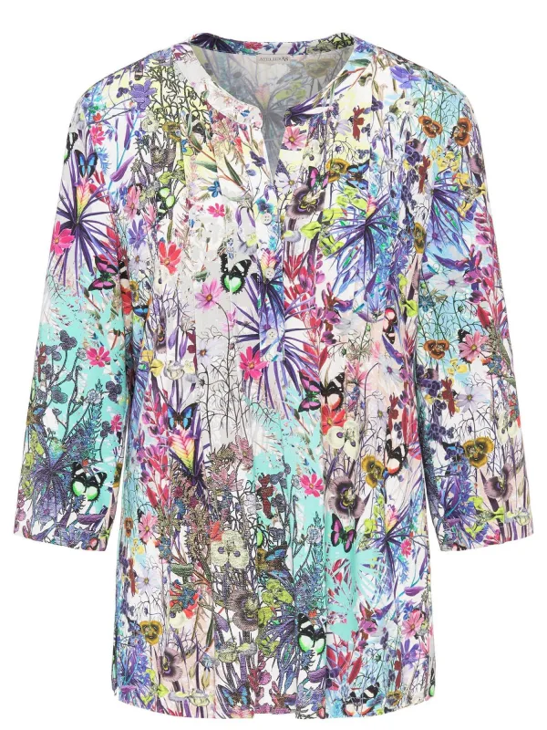 Blouse type: Wijde blouse; Materiaal: Viscose; Halstype: Uitgesneden hals; Motief: Bloemenprint; Kraag: Tuniek kraag; Details: Cut-outs, Plooien; Pasvorm: Normale pasvorm; Armlengte: Driekwart mouw; Lengte: Normale lengte