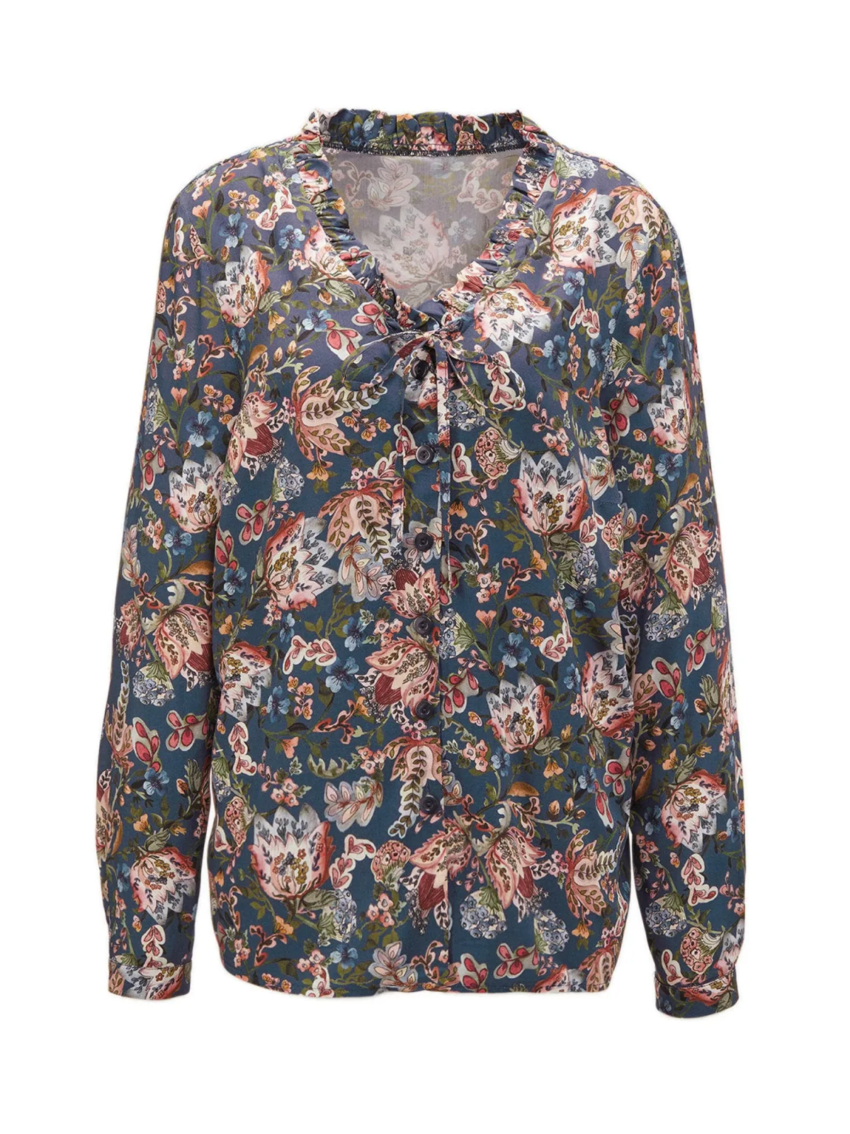 Blouse type: Blouseshirt; Type sluiting: Knoopsluiting; Materiaal: Viscose; Extra's: All-over patroon; Pasvorm: Losse pasvorm; Armlengte: Lange mouw; Lengte: Normale lengte