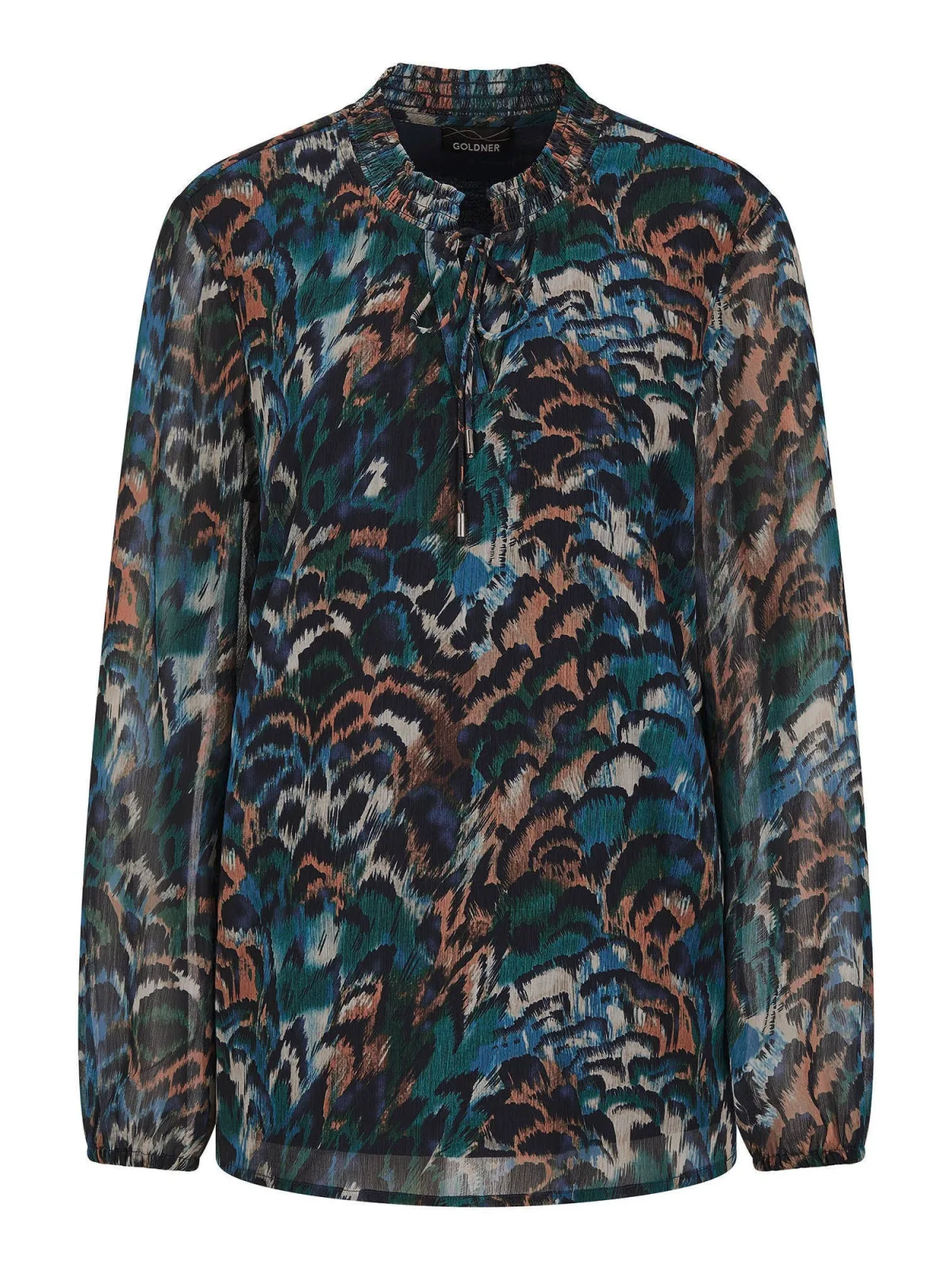Blouse type: Klassieke blouse; Design: Om te knopen/binden; Type sluiting: Elastische band; Materiaal: Chiffon; Kraag: Opstaande kraag; Extra's: Licht transparant, All-over patroon; Pasvorm: Normale pasvorm; Armlengte: Lange mouw; Lengte: Normale lengte