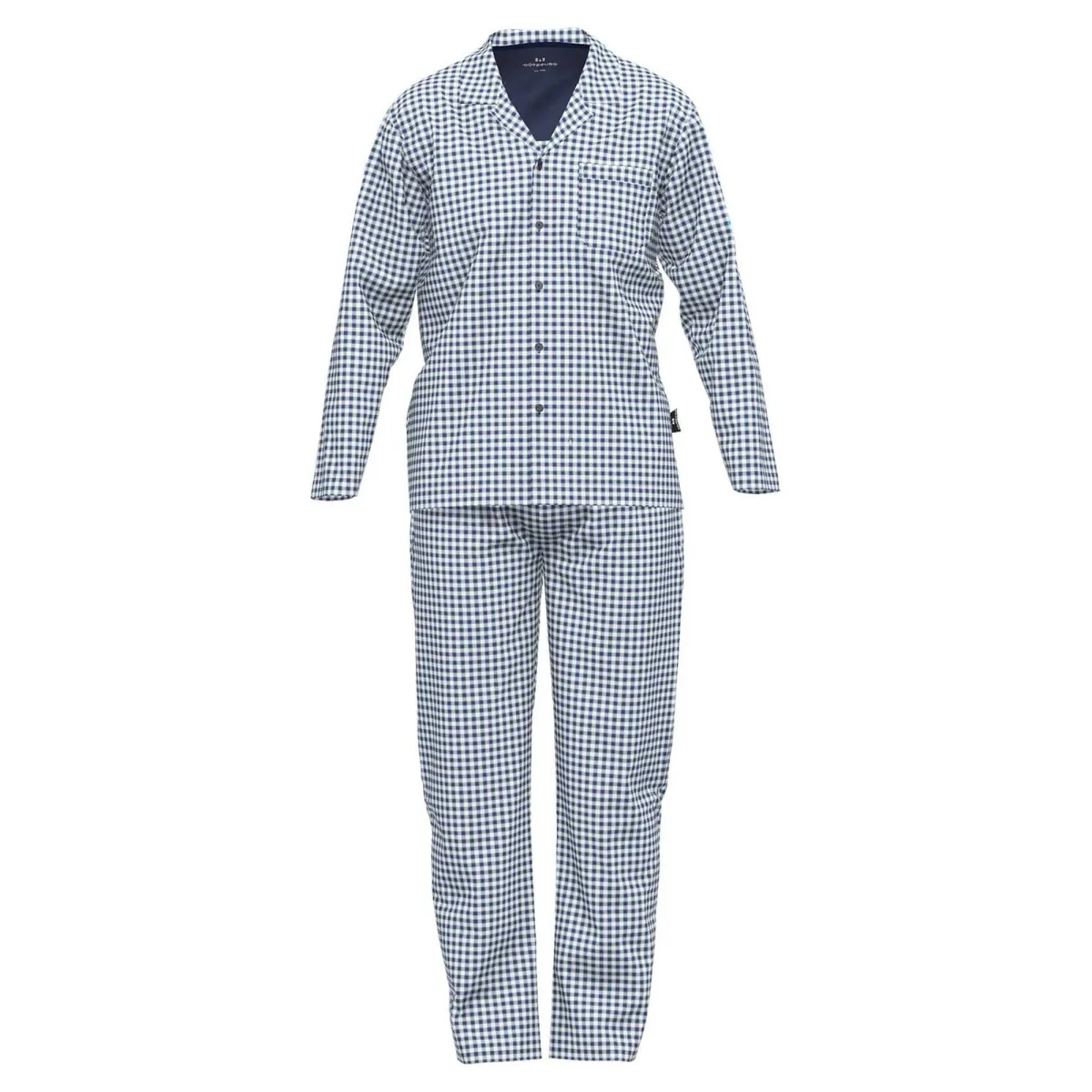 Pyjama's voor mannen van het merk Goetzburg. Geruite top met knopen en reverskraag. Lange geruite broek met elastische tailleband. Comfortabele katoenkwaliteit.