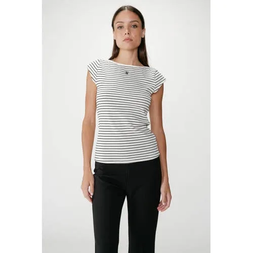 Deze ecru met zwarte gestreepte dames top van katoen van Grace & Mila is een lichte basic met een frisse, grafische uitstraling. De horizontale strepen en subtiele logo-print geven een moderne twist, terwijl de boothals en korte, rechte mouwen zorgen voor een vrouwelijke lijn. Ideaal voor het voorjaar, wanneer je iets luchtigs wilt dat er toch verzorgd uitziet.Details die het verschil maken Gemaakt van 95% katoen / 5% elastane voor een soepele, zachte stof die licht meerekt Ecru / zwart streepdessin met logo-print voor een rustige maar opvallende look Boothals die mooi langs de halslijn valt Korte, rechte mouwen voor een casual en toch nette uitstraling Onderdeel van de Boutique collectie, in standaardmaten verkrijgbaarMakkelijk te stylen in jouw dagelijkse looksDeze top past goed bij een rechte jeans, een zwarte pantalon of een luchtige rok. Draag er sneakers onder voor een ontspannen dag, of kies voor sandalen voor een iets gekledere combinatie. Door de neutrale kleuren is de top eenvoudig te combineren met zowel lichte als donkere onderstukken.Grace & Mila: moderne vrouwelijkheidGrace & Mila staat bekend om kleding die vrouwelijkheid en eigentijdse stijlen combineert. Met aandacht voor details en draagbaar design brengt het merk collecties die prettig aanvoelen in het dagelijks leven. Je kiest hiermee voor een mode-item dat stijl en gemak op een toegankelijke manier samenbrengt.Een lichte, gestreepte top die je eenvoudig erbij pakt als je er moeiteloos verzorgd uit wilt zien.