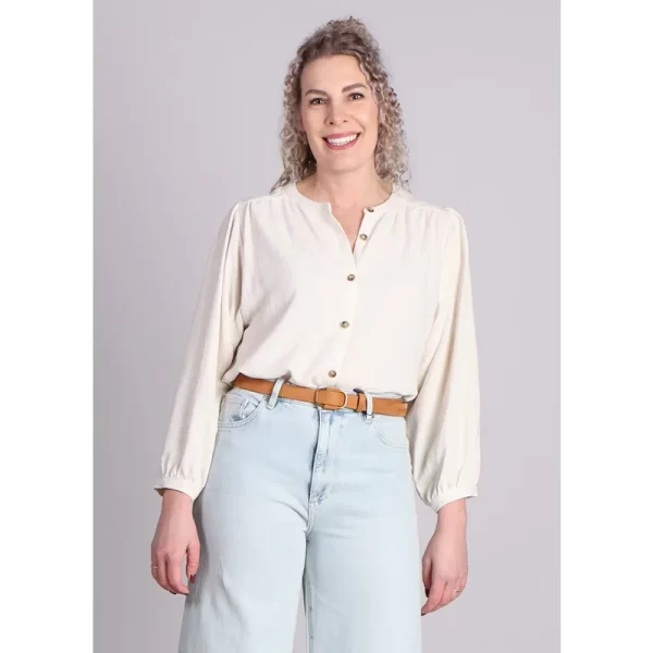 De PORTRAIT blouse van Grace & Mila is de perfecte combinatie van casual chic en vrouwelijke elegantie. Gemaakt van een luchtige linnenmix, biedt deze beige blouse ultiem draagcomfort en een verfijnde uitstraling. De mandarijnkraag en subtiele plooien aan de voorkant zorgen voor een stijlvolle en verfijnde touch. Dankzij de lange mouwen met knoopsluiting en de licht getailleerde pasvorm, is deze linnen blouse ideaal voor zowel casual als formele gelegenheden. Een veelzijdige must-have die moeiteloos in elke garderobe past. Product details: Casual fit Lange mouwen met knoopmanchetten Mandarijnkraag Knoopsluiting aan de voorkant Afgeronde zoom Subtiele plooien bij de schouders Materiaal: 93% viscose, 7% linnen Valt iets ruimer, twijfel je tussen 2 maten? Bestel dan de kleinste maat. Het model is 1,75 m lang, heeft een tailleomtrek van 58 cm en heupomtrek van 86 cm, en draagt maat S. Wij raden een handwas of wasbeurt op lage temperatuur aan voor een langdurige kwaliteit
