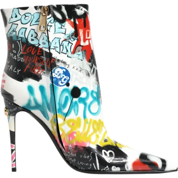 Stap eruit, val op en maak een statement. Deze laarzen met graffiti-print geven direct een edgy stijl aan je garderobe. Gemaakt van luxueus leer, bieden ze duurzame, onderhoudsarme draagbaarheid. De puntige neus zorgt voor een verfijnde silhouet, terwijl de stilettohak zorgt voor een zelfverzekerde stap. Geniet van een veilige, verstelbare pasvorm met de ritssluiting aan de zijkant. Perfect om een gedurfde touch toe te voegen aan zowel dag- als avondlooks, zijn deze laarzen ontworpen om de aandacht te trekken en elke outfit te verheffen.