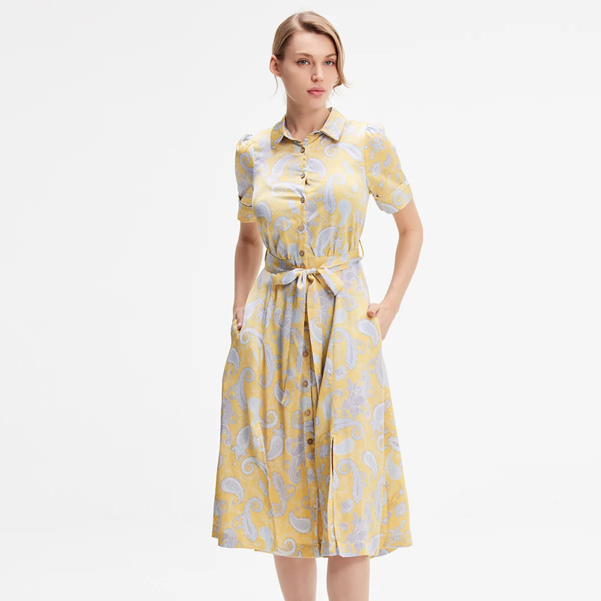 Een tijdloos stuk om te combineren met sandalen of sneakers in de zomer of zelfs laarzen en een perfecto in de herfst. Eenvoudig en gemakkelijk te dragen snijden, met verfijnde details en een elegante afdruk op enigszins satijnen viscose. Productdetails • Vorm: uitlopende, gemonteerde maat • Lengte: 109 cm • Kraag • Korte mouwen • Middenkoppeling