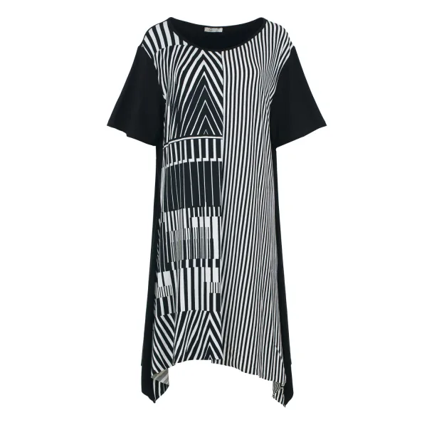 Deze Graphic Elegance Plus Size Jersey-jurk toont een moderne kijk op klassieke strepen. Hij is gemaakt van een zachte mix van 92% viscose en 8% elasthaan en biedt zowel comfort als elasticiteit. De jurk heeft een harmonieuze mix van verticale, horizontale en diagonale strepen in zwart en wit, waardoor een visueel opvallend patroon ontstaat. De asymmetrische zoom voegt een eigentijds randje toe aan het ontwerp, terwijl de ontspannen pasvorm ervoor zorgt dat het gemakkelijk past bij een plus-size figuur. Deze jurk is een chique keuze voor wie van gedurfde patronen houdt in combinatie met de tijdloze aantrekkingskracht van een monochroom palet.