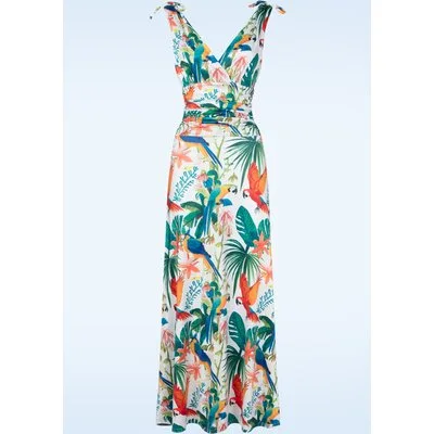 ''Feathered fiesta in full swing!'' Vier de zomer in deze geweldige maxi jurk! Ze heeft een overslag top met speelse vaste strikbandjes op de schouders, een super flatterende geplooide tailleband en loopt vanaf daar uit in een flowy maxi rok. Ze is uitgevoerd in een soepel, stretchy slinky wit stofje met een fantastische tropische print met bladeren, bloemen en papagaaien. * Maxi jurk * Gevoerd voor extra comfort * Vaste overslag * Vaste strikbandjes * Super flatterende, geplooide tailleband * Geen rits of knopen; aantrekken en ready to go! * Reikt bij een lengte van 1,70 m tot aan de grond