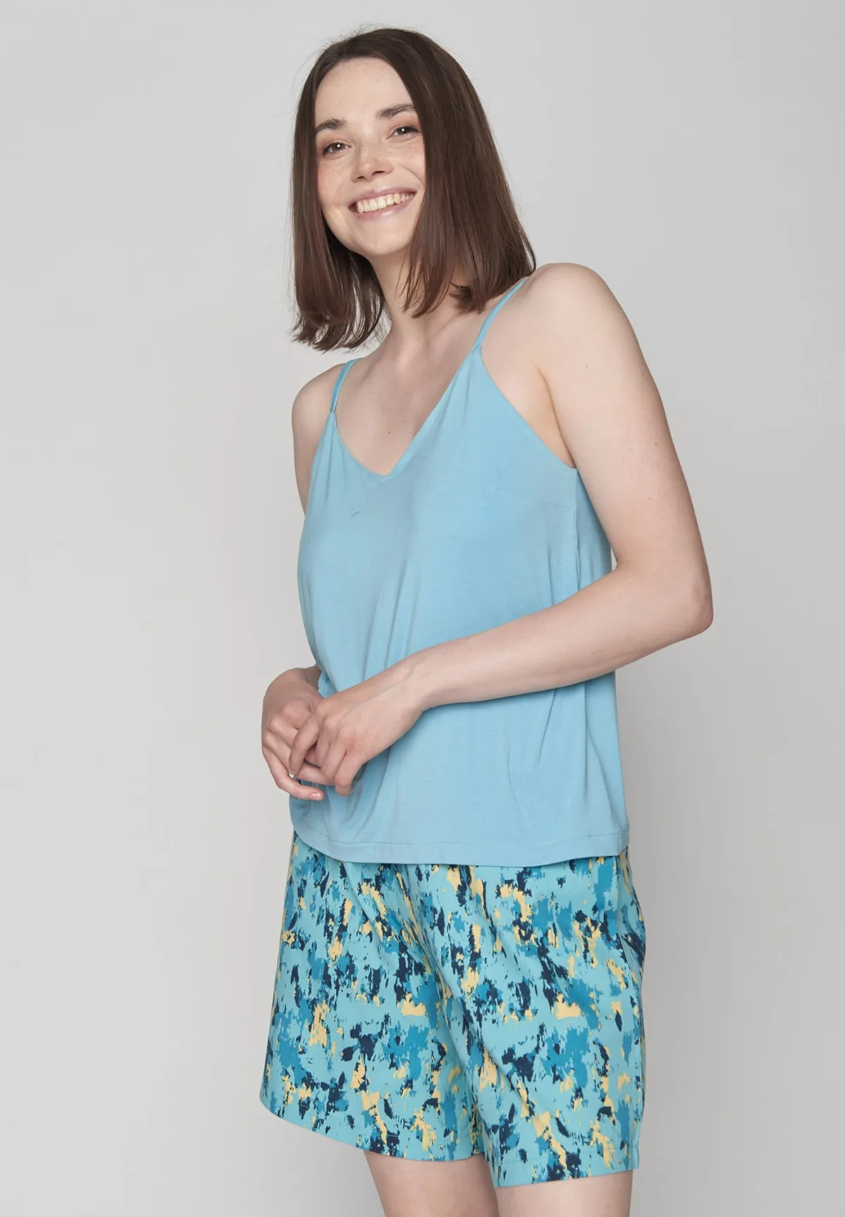 Design: Gevoerde zoom/rand; Materiaal: Jersey; Halstype: V-hals; Motief: Effen; Soort bandjes: Spaghettibandjes; Extra's: Op staal naden; Pasvorm: Normale pasvorm; Armlengte: Mouwloos; Lengte: Normale lengte