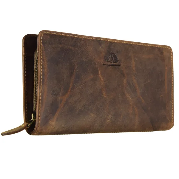 Design: Kaartvakjes, Ritssluiting; Materiaal: Glad leer; Extra's: Gewaxt, Label preegdruk, Vintage