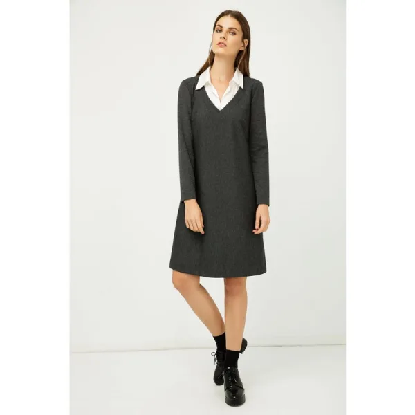 Jurk met lange mouwen in A-lijn silhouet. Kraag in overhemdstijl die de indruk wekt van lagen in contrasterende witte katoen/elasthan popeline stof. 2 figuurnaden bij de buste. De jurk is gemaakt van donkergrijs gestreepte stretch-brei. Gevoerd. Lengte jurk voor maat 38: 94cm. Door extra stof aan de zoom kan deze tot 4 cm naar beneden worden gelaten. Ons model is 178cm en draagt maat 36.