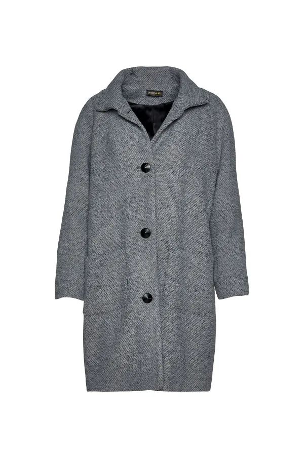 Grijze jas van wolmix. Raglanmouwen en een opstaande kraag. Twee opgestikte zakken aan de voorkant. Sluit aan de voorkant met 4 knopen. Losse pasvorm. Ons model is 176cm en draagt maat 36/S. Afmetingen voor maat 38/M (in cm): Schouder -48, Borst-52, Taille-54, Onderkant-56, Mouwlengte-52, Lichaamslengte-92. 40% wol-60% viscose. Accessoires zijn niet inbegrepen.