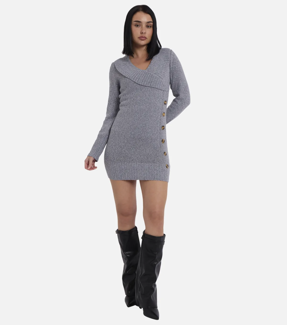 Deze grijze gebreide mini-jurk combineert de elegantie van een overslag met subtiele knoopdetails voor een look die moeiteloos bij elkaar past. De zachte truistof houdt je warm en comfortabel, terwijl het flatterende overslagsilhouet geschikt is voor talloze gelegenheden, van een informeel kopje koffie tot een avondje uit. Opvallend genoeg om alleen te dragen, veelzijdig genoeg om te combineren. Een onmisbaar kledingstuk dat bewijst dat comfort en stijl elkaar niet uitsluiten.
