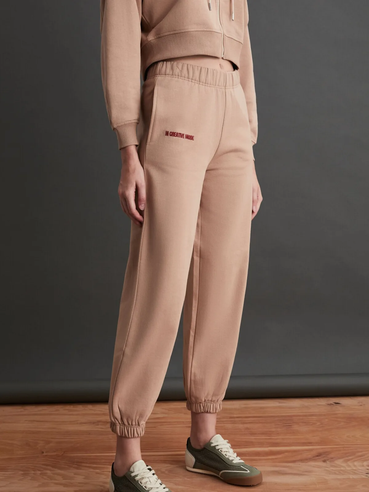 Design: Elastische taille/zoom, Zakken aan de zijkant; Materiaal: Sweatstof; Motief: Tekst print; Details: Borduursels, Gedrapeerd; Extra's: Applicaties, Voelt zacht aan; Lengte: 7/8 lengte; Pasvorm: Tapered; Taillehoogte: High waist