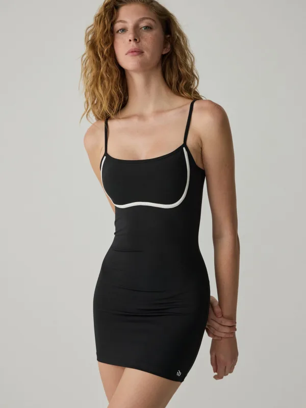 Design: Gevoerde zoom/rand, Diepe snit/decolleté, Contrasterende inserts; Materiaal: Jersey; Halstype: Carréhals; Soort bandjes: Spaghettibandjes; Extra's: Op staal naden, Voelt zacht aan; Lengte: Kort/mini; Snit: Figuur omarmend; Pasvorm: Aansluitende pasvorm; Armlengte: Mouwloos