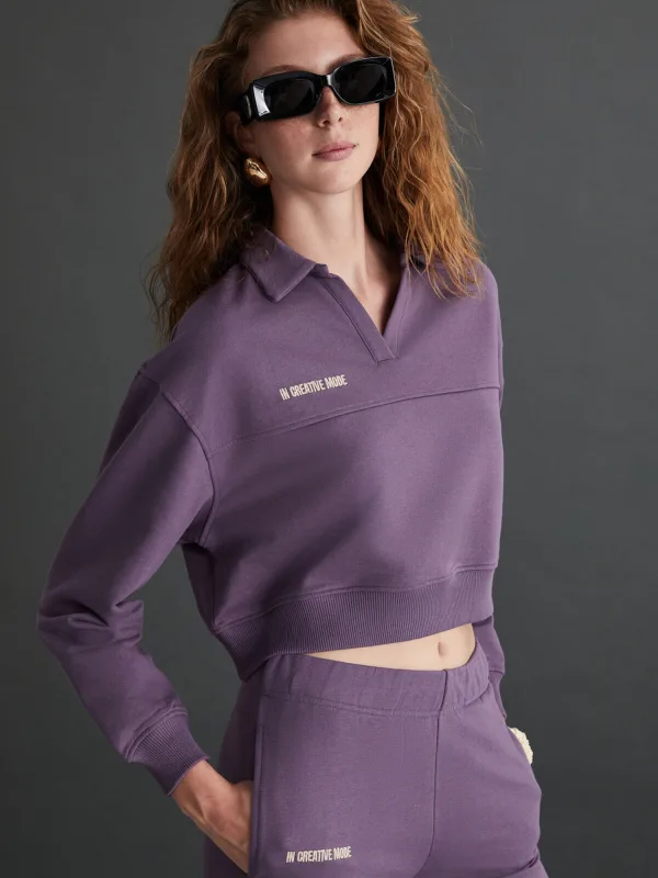 Design: Geribd ceintuurtje, Overcut schouder; Materiaal: Sweatstof; Halstype: Polokraag; Motief: Tekst print; Details: Borduursels; Extra's: Voelt zacht aan, Huidvriendelijk materiaal; Pasvorm: Losse pasvorm; Armlengte: Lange mouw; Lengte: Korte pasvorm