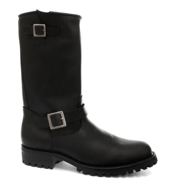 De Grinders Wild One zijn gemaakt van glad zwart leer om een strakke, verfijnde motorlaars te creëren. De riemen bevinden zich aan de voet- en bovenlijn en worden vastgezet via een spiegelafgewerkte Grinder-gesp om de pasvorm van de laars aan te passen. De hiel van deze laars is ook afgewerkt met panelen en is voorzien van een hittereliëf met het iconische Grinders Bulldog-logo, en de onderkant van de laars is voorzien van een dikke, oliebestendige zool die deze laars duurzaam maakt en hem een langdurige kwaliteit geeft. • Ingenieurslaarzen met hoge pijpen • Goodyear welted • Dikke Commandozool • Voorzien van een bovenwerk van premium zwart leer