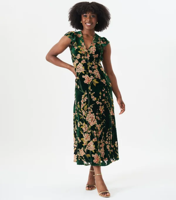 Groene bloemen Devore midaxi-jurk met ruches en V-hals Prijzen